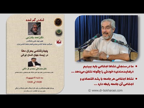 احمد بخارایی: مقولهی نشاط اجتماعی در بحث بحران معنا کجا قرار میگیرد؟ #بحران_معنا یک نوع گمگشتگی و غفلت است که از نظر جامعهشناسی، معطوف به سه زمان گذشته، حال و آینده است. معطوف به گذشته، بحران معنا یک شبه خلق نشده و تاریخی و فرهنگی است. آن قالب گیری تاریخی و فرهنگی، کمک میکند به این دورهی بحران معنا.